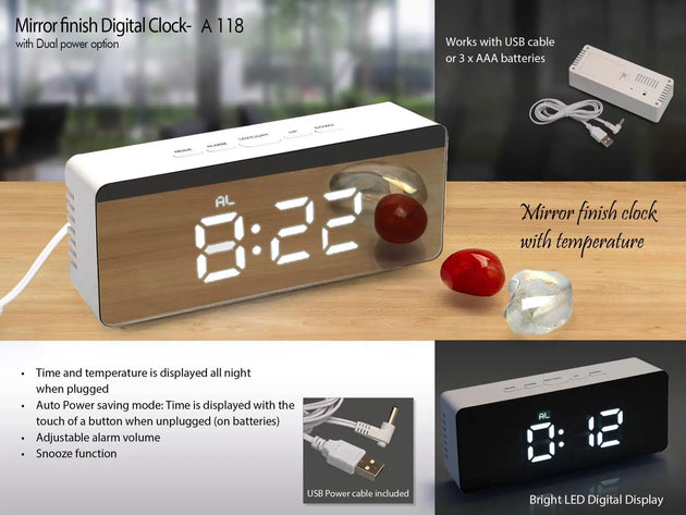 Elevate your modern décor with the A118 Mirror Finish Digital Clock, designed to offer both style and functionality. With its sleek, mirror-finished surface and integrated temperature display, this rectangular digital clock adds a sophisticated touch to any room while providing essential time and climate information. The dual power options ensure flexibility and convenience, making it a practical choice for various settings.