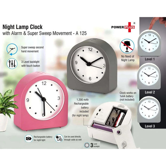 The A125 Night Lamp Clock with Alarm and Super Sweep Movement is the perfect addition to any space, combining essential functions with modern design. Its adjustable backlight and rechargeable features make it both practical and stylish, ideal for enhancing your daily routine.