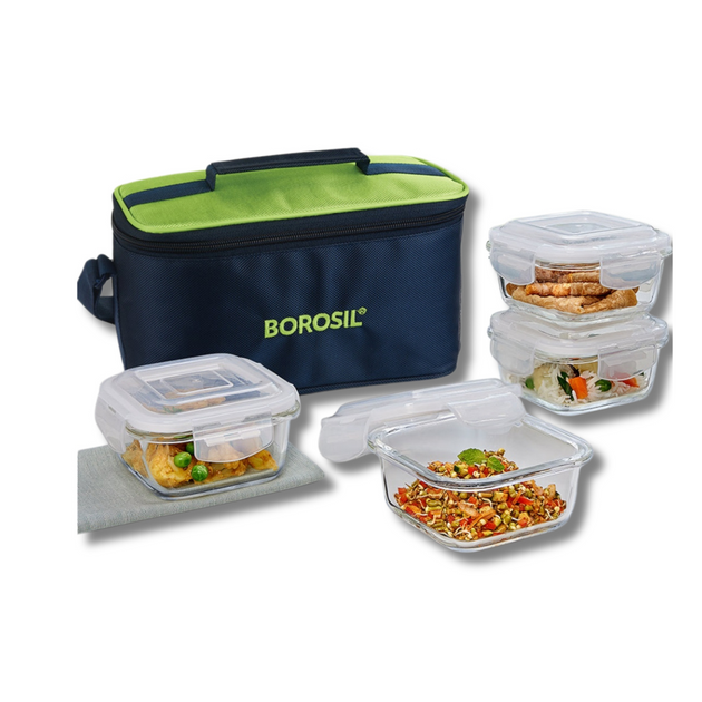 The Alfa Aroma Green Glass Lunch Box, Square x 4, is a set of four sleek, square-shaped glass containers with airtight, leak-proof lids. Designed for convenient meal storage, these lunch boxes are made from durable, food-safe glass, ideal for retaining food freshness. The vibrant green lids add a stylish touch, making them perfect for on-the-go meals, leftovers,
